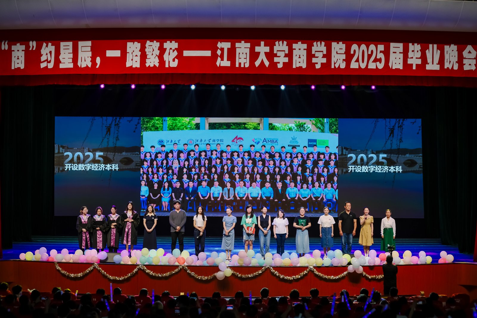 6月15日晚,商学院2025届“‘商’约星辰,一路繁花”毕业晚会在文浩馆举行。学院领导班子、企业家辅导员代表、往届校友代表、各系部主任、毕业班班主任、学院教师代表、辅导员老师与全体2025届毕业生一同观看晚会。