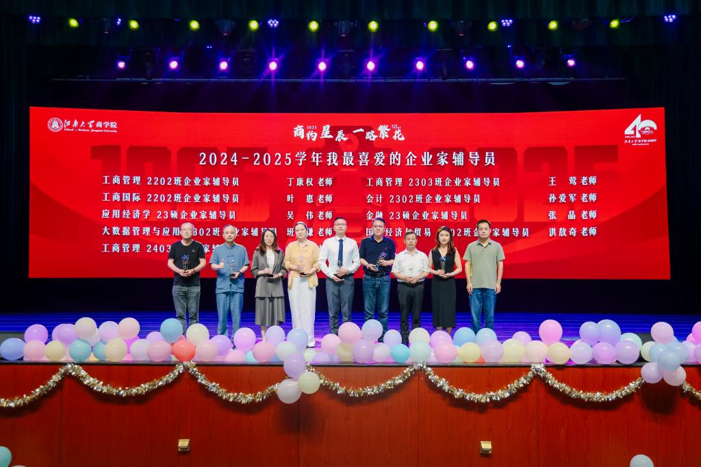 商学院院长浦徐进为2024-2025学年江南大学商学院“我最喜爱的企业家辅导员”获得者颁发奖牌,表彰和感谢他们在学生思想领航、生涯规划、双创教育和就业指导等工作中提供的专业化辅导。