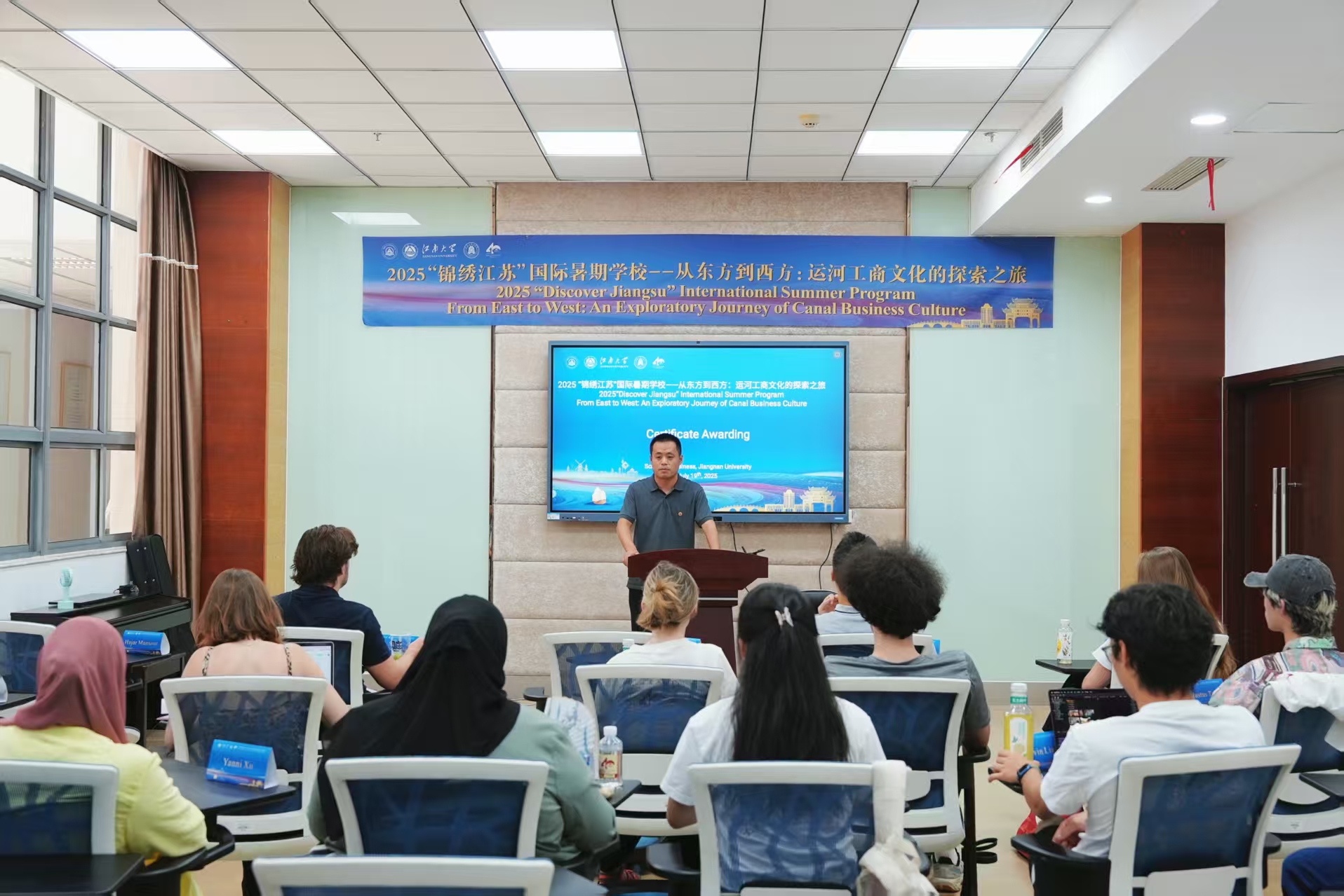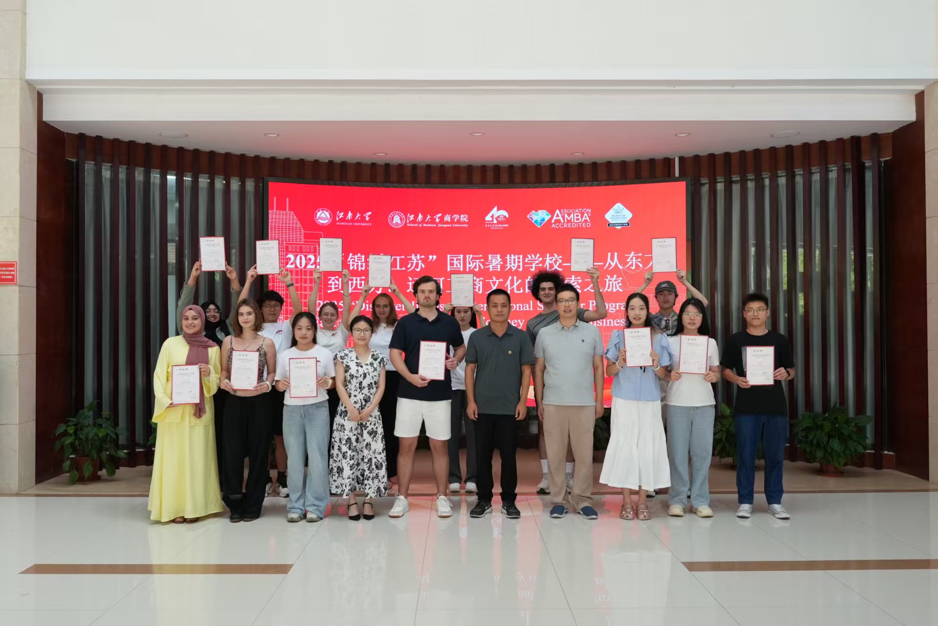 7月21日,由江苏省教育厅主办、江南大学承办的2025年“锦绣江苏”国际暑期学校——“从东方到西方:运河工商文化的探索之旅”,在江南大学落幕。江南大学商学院院长浦徐进教授、项目教师代表吴正阳,来自荷兰蒂尔堡大学、埃因霍芬理工大学,澳大利亚莫纳什大学、皇家墨尔本理工大学、迪肯大学等5所高校的国际学生,以及中方优秀学生代表参加结营仪式。结营活动由江南大学商学院国际教育办公室主任刘舒皎主持。
