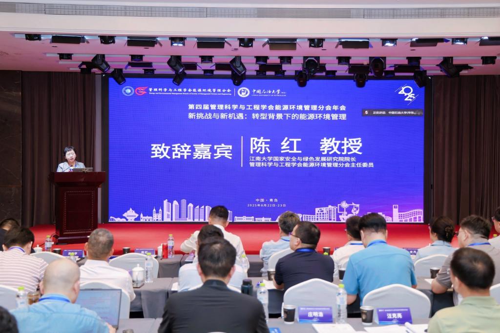 管理科学与工程学会副理事长、湖南工商大学党委书记陈晓红院士代表管理科学与工程学会对本次年会的胜利召开表示热烈祝贺,并寄语青年学者要聚焦转型期国家重大战略问题,在交叉学科研究、方法创新与实证应用中勇挑重担。中国石油大学(华东)副校长周鹏教授代表联合主办单位对各位与会代表的到来表示热烈欢迎,并期待大会继续承担好建设学术共同体、凝聚专家共识、引领前沿发展的重要角色。管理科学与工程学会能源环境管理分会主任委员、江南大学国家安全与绿色发展研究院院长陈红教授在致辞中表示当今世界正经历百年未有之大变局,面对全球气候变化的严峻挑战,绿色低碳健康发展正在重塑国际能源治理格局,也深刻影响着产业结构、技术路线和发展模式。对于中国而言,实现“碳达峰、碳中和”不仅是国际承诺,更是引领新一轮科技革命和产业变革的战略机遇,是统筹安全与发展的必由之路。她指出,分会作为学术共同体,有责任也有能力在推动国家战略落地中做出积极贡献,在全球能源环境治理体系中发出中国声音、提出中国方案、贡献中国智慧。
