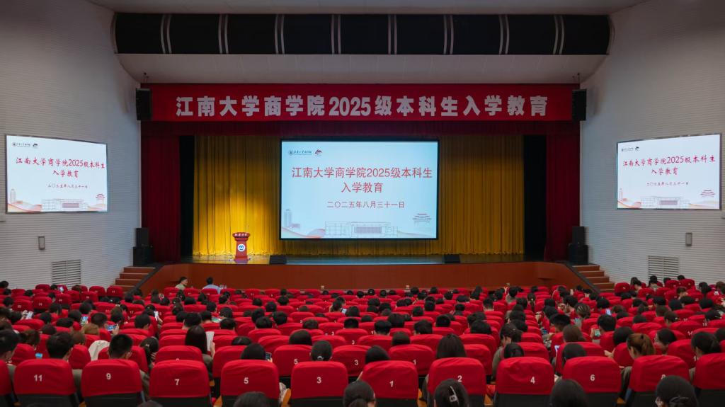 8月31日,商学院2025级新生入学教育在文浩馆举行。商学院教务办刘荣杰老师,雪浪派出所民警刘强,本科新生辅导员蒋天琪、陈滢恬以及全体2025级本科新生参加。