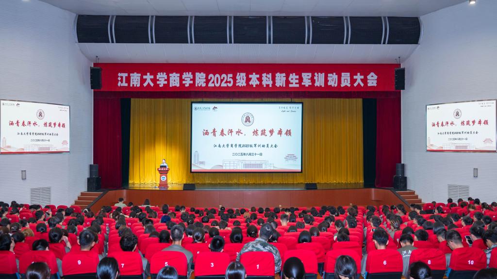 8月31日,商学院2025级本科新生军训动员大会在文浩馆举行。学院党委副书记兼副院长孙小芳,退役在校大学生丁可欣,本科新生辅导员蒋天琪、陈滢恬,以及全体2025级本科新生参加大会。