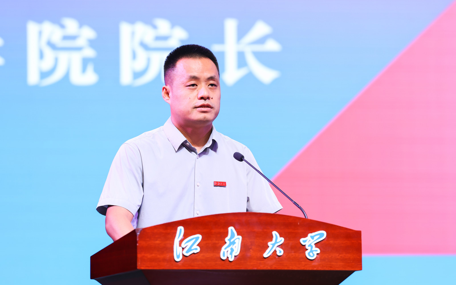 刘长青带领全体新生佩戴院徽。他寄语新生,珍惜大学时光,不负青春韶华,始终秉承学院“笃学明道,经业济世”的院训精神,以“千磨万击还坚劲”的韧性面对挑战,以“越是艰险越向前”的斗志开拓新局,努力成长为于社会有用、于时代有光的栋梁之材!