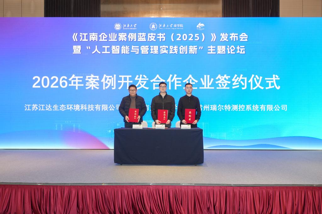 浦徐进代表江南大学商学院向无锡市太极实业股份有限公司等10家2025年案例开发合作企业代表赠送《江南企业案例蓝皮书(2025)》。马骏代表江南大学商学院与江苏江达生态环境科技有限公司和常州瑞尔特测控系统有限公司进行2026年案例开发合作企业签约。