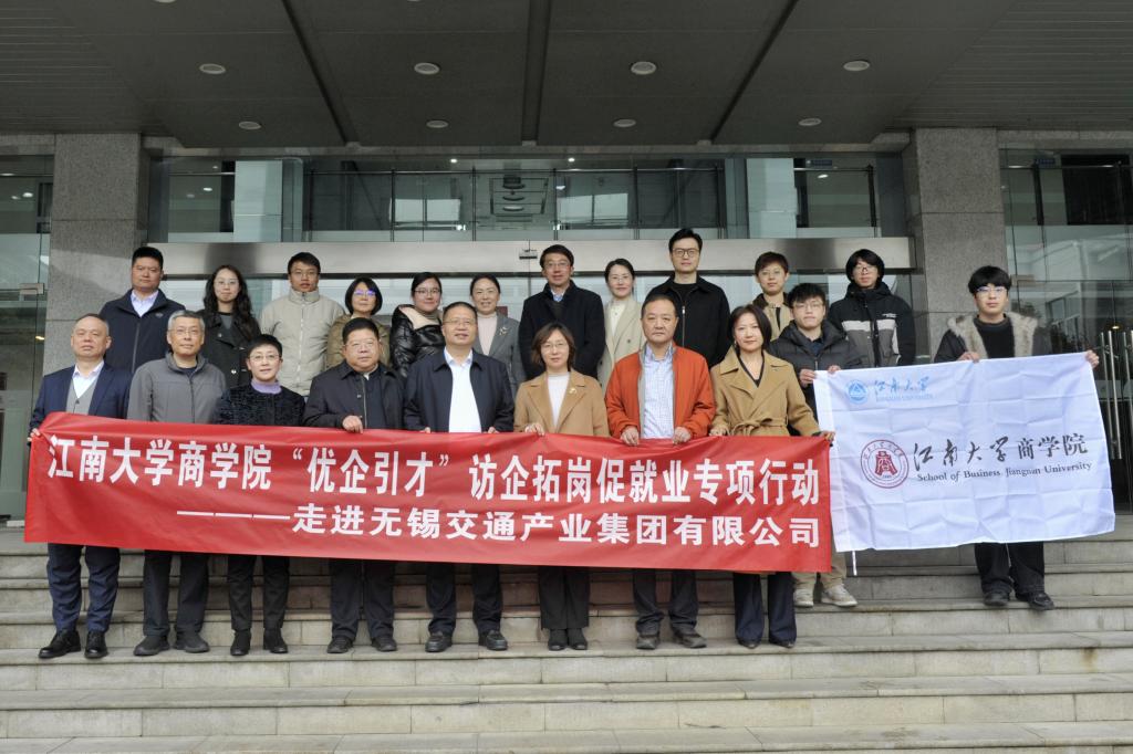 2月27日下午,江南大学党委副书记、纪委书记李旸带队赴无锡交通产业集团有限公司开展“优企引才”访企拓岗活动。江南大学商学院党委书记刘长青、党委副书记兼副院长郑丹丹及商学院师生代表参加活动。无锡市交通集团党委书记、董事局主席许青凯,党委副书记、工会主席刘艳红及下属集团高管、校友代表出席活动。