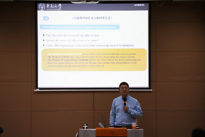 讲座中,杜运周教授以问题为切入点展开,指出目前某些管理问题研究中往往存在着问题和方法不够匹配、理论与实际脱离、因果关系认识不清等问题;现在主流的定量净效应分析范式对“组合”问题分析乏力,难以有效分析具有“组合”特征的创新与复杂创业观现象。杜教授提出了一个生活中十分常见却耐人寻味的问题,即什么是因果关系?他从因果关系和实证主义传统、因果关系本质主义理论、约翰斯图亚特米尔和因果关系三个方面,对因果关系问题进行了透彻的分析。随后,杜教授从上述问题总结出,运用传统方法对“因果”关系的研究,没有从“充分必要”的角度去讨论,这往往是不科学的。因此,他提出QCA(定性比较分析)的方法可以很好地解决该问题。随后,从理论联系实际的角度,杜教授从QCA与传统分析方法和范式的比较、“必要性与充分性”、“因果复杂性”等方面对QCA的原理进行了深入讲解,并结合具体的案例进行QCA运用分析。整场讲座内容充实,详略得当,但又不乏风趣。