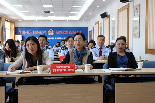 为深入开展“不忘初心、牢记使命”主题教育,以丰富学习载体,采取领学、导学和辅学等形式组织好党支部开展学习教育活动,2019年10月23日下午,商学院管理学科教工第一党支部与联学共建的无锡税务第一稽查局党支部、江南大学财务处党支部,以及结对共建的商学院2018级硕士生党支部联合开展“不忘初心、牢记使命”主题教育党日活动,联学共建党支部的党员近80人在无锡税务第一稽查局会议室进行党课教育活动。
