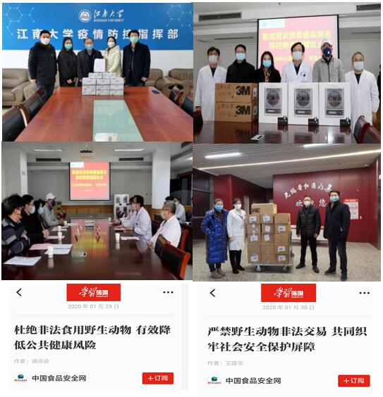 面对疫情,我们也看到了校友和学者的坚守和担当。商学院MBA学生和校友分别于1月31日、2月1日将从海外采购到的6000只3M N95-8210口罩送达无锡市第五人民医院,江阴卫健委和无锡市人民医院等防控一线医务工作者手中,2月14日,MBA校友代表再次来到学校给学院老师捐赠1000只医用一次性口罩,顾正彪副校长代表学校接受了捐赠。“大爱无疆、众志成城——抗击疫情:江南MBA在行动”新闻刊发无锡新媒体《今日头条》;食品安全风险治理研究院团队于1月29日起在《中国食品安全网》发表《杜绝非法食用野生动物,有效降低公共健康风险》等5篇研究文章,并被“学习强国”转载刊发。
