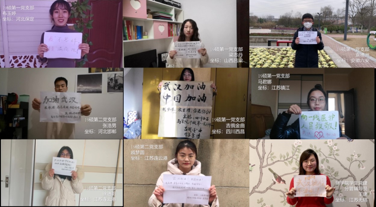写祝福声援防疫,商院人正能量满满。疫情来势汹汹,我们隔“毒”不隔“爱”。学院开展“疫不容辞,情满商院”师生祝福接力活动。本次活动由19硕第一、第二党支部及本科生经济学科第二党支部联合发起,教师支部书记刘勇、湖北籍教师付辉博士、辅导员王璁和孙旭媛、在社区担任防疫志愿者的封佳洋、史京等党员同学都参与到这一网络接力活动中,为受“疫”所困的湖北武汉同学送祝福,为奋战一线的最美逆行者祈平安,更为打赢疫情防控阻击战加油助威。