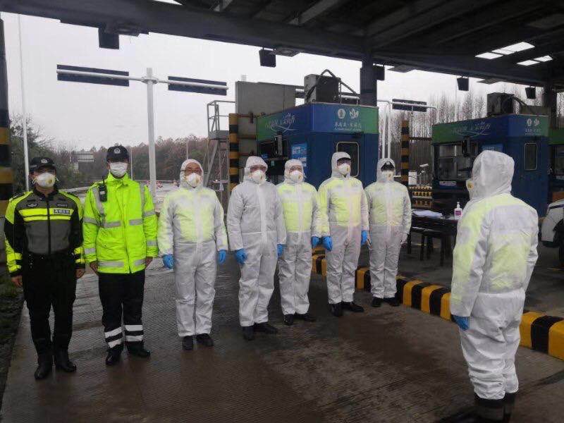 团队成员在防疫检查点站岗执勤