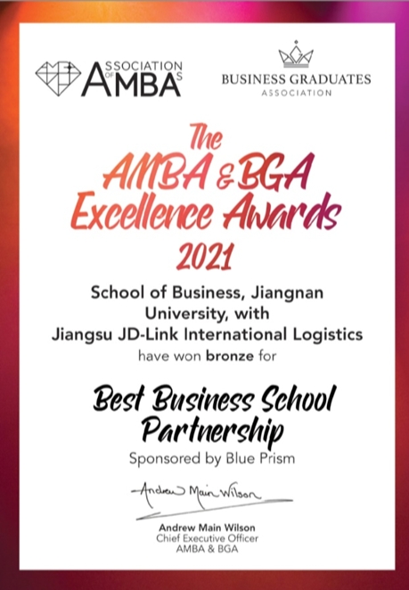 2021年度AMBA&BGA卓越奖共设11项奖项,由全球通过AMBA认证和BGA认证的商学院申报参评。我校MBA教育中心与江苏佳利达国际物流股份有限公司联合申报的“最佳商学院合作伙伴奖”以校企合作方面的卓越成效荣获铜奖。2021年AMBA & BGA卓越奖,国内有四所高校上榜,分别是东华大学(全球最佳社会责任奖银奖)、江南大学(最佳商学院合作伙伴奖铜奖)、哈尔滨工业大学(最佳创新战略奖提名奖)和汕头大学(最佳社会责任奖提名奖)。