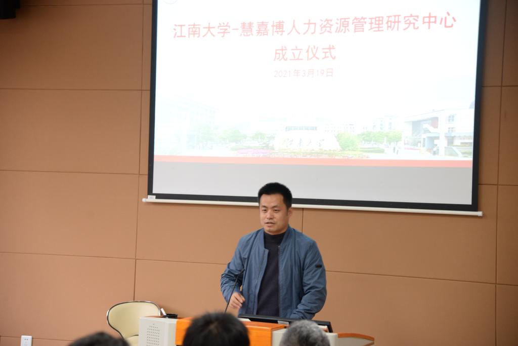 揭牌仪式上,浦徐进对江南大学人文社会科学的整体发展情况进行了介绍,对无锡人力资源开发研究基地前期取得的成果给予充分肯定,并对“江南大学-慧嘉博人力资源管理研究中心”的成立表示祝贺,希望通过“江南大学-慧嘉博人力资源管理研究中心”加强校企合作,为无锡市发展出谋划策,也为无锡市人力资源市场发展建言献策。