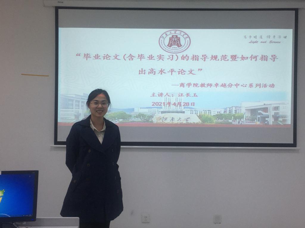 为进一步落实学党史、办实事、开新局,深入推进本硕教学规范化管理,4月28日下午,商学院教务办联合教师卓越分中心,邀请学院组织管理系系主任汪长玉副教授以“毕业论文的指导规范暨如何指导出高水平论文”为主题,在学院221举办本硕教学规范化管理的第二场讲座。学院近五年新进教师参加了本次讲座。