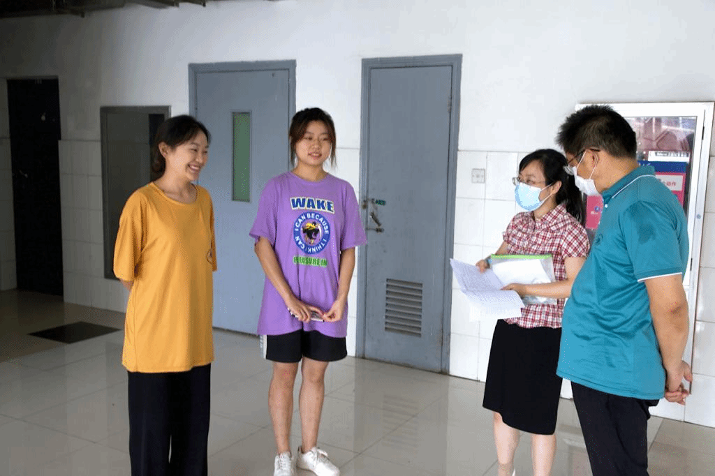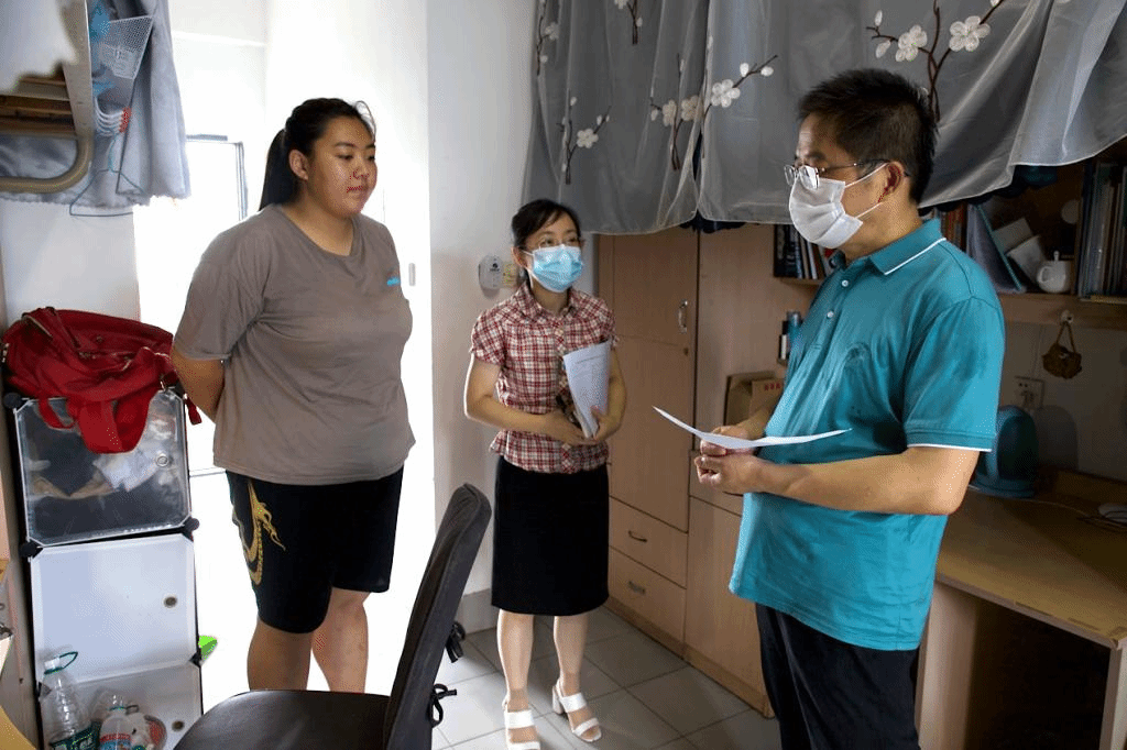 走访完研究生宿舍,徐锡清又来到浩苑本科生寝室进行走访慰问。来自新疆巴州的谢琳贤同学8月初在参加完全国大学生田径锦标赛后,受疫情影响,无法返回老家,选择留校备考研究生。徐锡清仔细询问谢琳贤参加比赛的情况,并对其在全国大学生田径锦标赛上取得的优异成绩表示肯定,鼓励她在考研复习中,也要发扬拼搏精神,认真复习,实现深造愿望。