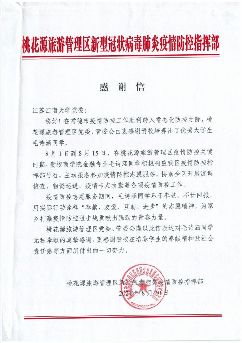 近日,学校收悉了一封感谢信,桃花源旅游管理区新冠病毒肺炎疫情防控指挥部在信中表达了对商学院毛诗涵同学于该区疫情防控志愿服务中无私奉献的真挚感谢,以及感谢学校对培育江南学子奉献精神及社会责任感等方面所付出的一切努力。