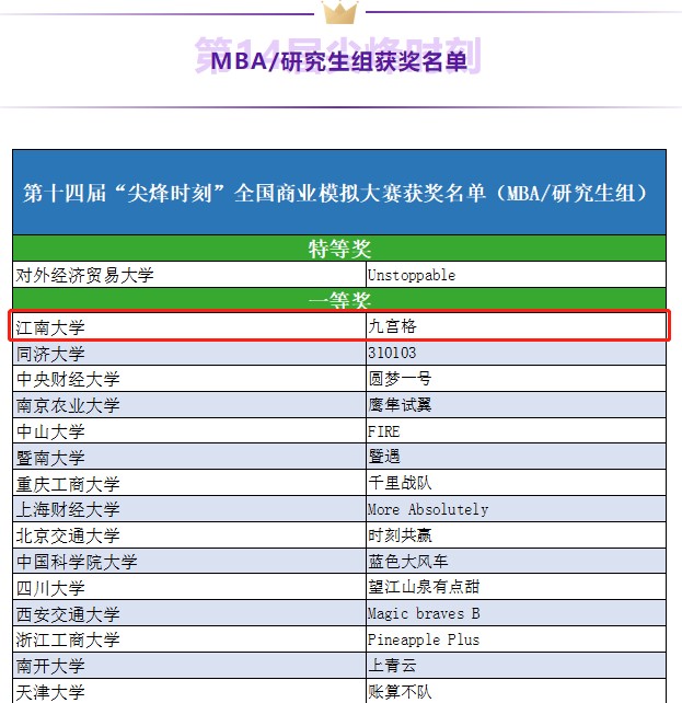 历年来,我校MBA教育中心共组织了520多名MBA/MEM学生报名参加“尖烽时刻”商业模拟赛事,12次闯入全国总决赛,获得一等奖5项、二等奖7项及多项单项奖。我校MBA/MEM研究生在“尖烽时刻”国际赛事平台上,充分模拟商业实战环境下的各类企业经营决策,与来自全国众多院校的师生互相切磋、交流分享,通过比赛识别自身价值、挖掘独特潜能、锻炼系统思维,有效提升了创造力、领导力和团队协作能力。