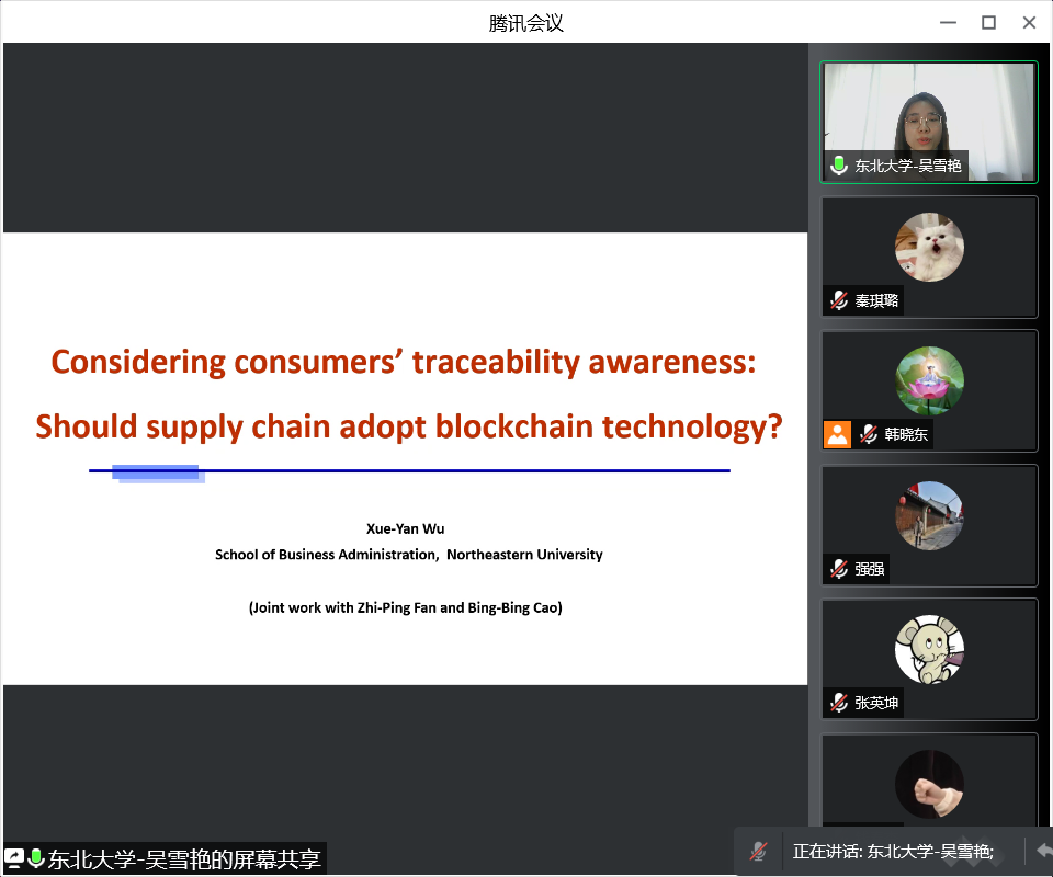 吴雪艳分享了基于消费者溯源意识考虑供应链应用区块链技术的决策问题。研究构建了一个由制造商、零售商和供应商组成的三级供应链,其中制造商为引导者。在消费者效应函数的构建中,考虑到消费者感知价值、零售价格、溯源意识三个方面的影响。可以发现,溯源意识对零售商、供应商、制造商的收益都是存在正向作用的。供应链在考虑是否采用区块链技术时,应将消费者的可追溯性意识作为决策的关键依据。当消费者的可追溯意识较高时,供应链采用区块链技术的收益较高。