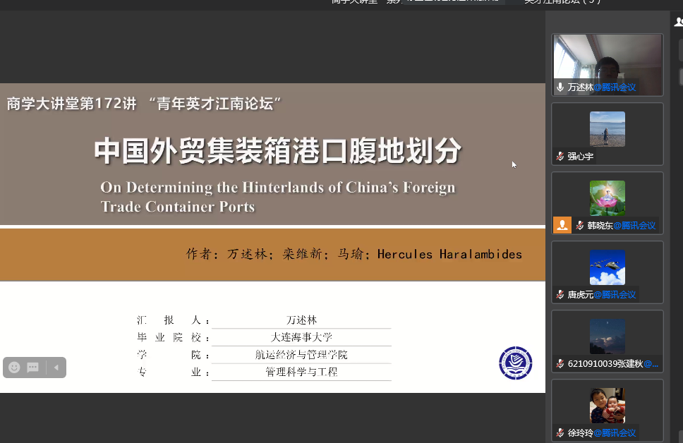 “奋斗是青春最靓丽的色彩”,适逢五四青年节之际,“商学大讲堂”系列要闻第172讲——青年英才江南论坛(3),5月5日下午通过腾讯会议平台线上举行。来自浙江大学的党敬淇博士、东北大学的齐小源博士和大连海事大学的万述林博士依次为大家分享了自己的研究成果。本次讲座由商学院副院长王雷教授主持,商学院教师和研究生200余人聆听了本次讲座。