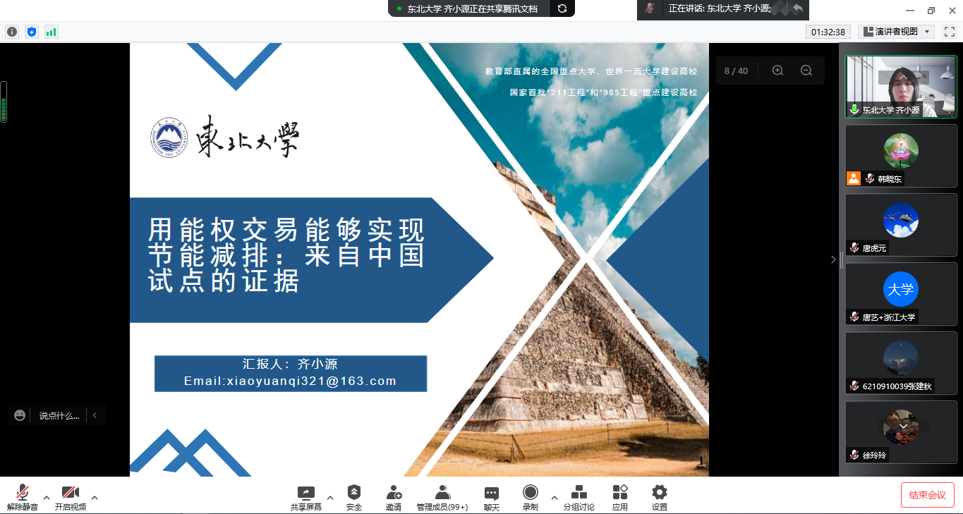 党敬淇分享的主题是空气污染及其政策干预对中国制造业企业技术进步与创新的影响。文章运用双重固定效应回归和工具变量两阶段最小二乘法进行因果分析,通过构建“政策强度”变量来数量化政策,建立了基于工具变量的局部混合中介模型进行机制分析,并采用“十一五”规划和两控区政策进行案例分析。研究发现,政策干预是空气污染影响中国制造业企业技术进步与创新的主要渠道。
