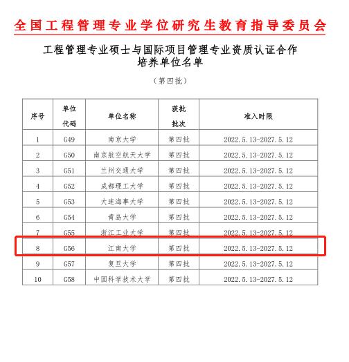 5月13日,全国工程管理专业学位研究生教育指导委员会发布通知,确定江南大学成为第四批工程管理硕士(MEM)与国际项目管理资质认证(IPMP)合作培养单位。