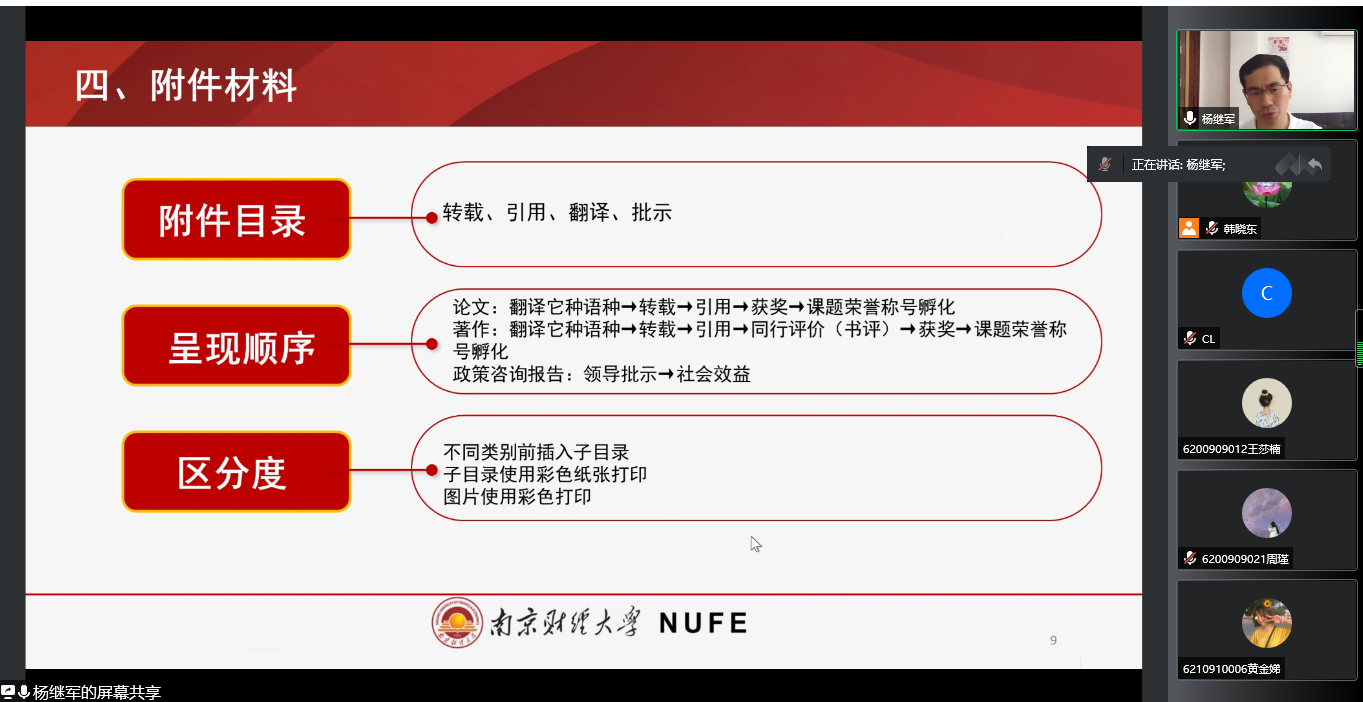 杨继军从成果奖分布情况、申报表构成、评审流程、附件材料和申报案例五个方面向大家进行了“江苏省哲学社会科学优秀理论成果奖”的申报经验传授。他从2018年和2020年两届成果奖分布情况出发,分析经济管理类著作、论文和研究报告的获奖情况;随后他从申报表的构成,即成果内容简介、成果创新简介和社会效应和评价三个方面详细分析注意事项,强调如何准备社会评价。接着,杨继军介绍了奖项评审机构、要求与流程,并从附件目录、呈现顺序和区分度等方面分析如何做好附件材料。并通过3个成功申报案例,对社科奖申报进行了经验总结,他认为平时要加大对成果的宣传、注意成果的集成性、成果奖申报要提前培育、学术研究要聚焦、青年学者从高质量学术论文入手。最后对申报者关心的主要问题进行了详细解答。