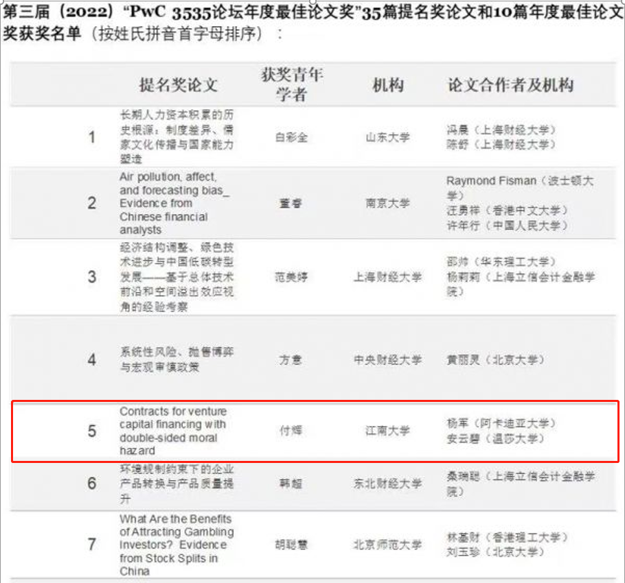 2022年9月2日,第三届PwC 3535论坛颁奖典礼在北京国家会议中心举行,江南大学商学院付辉副教授与合作者安云碧、杨军两位教授撰写的论文“Contracts for venture capital financing with double-sided moral hazard”(《具有双边道德风险情境的风险投资融资契约》)获PwC 3535论坛2022年度最佳论文提名奖(https://www.pwccn.com/zh/3535summit.html#best-paper-award)。
