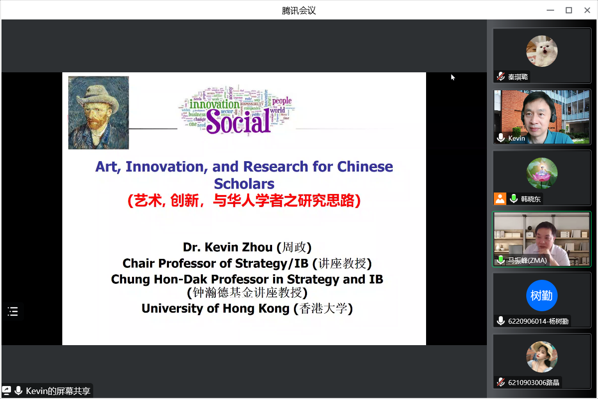 9月16日上午,“商学大讲堂”系列要闻(第186讲)---“学术名家讲坛(10)”在腾讯会议平台举行。本次讲座邀请到香港大学经管学院周政教授,作题为“Art,Innovation,and Research for Chinese Scholars”的学术分享,报告由商学院马振峰教授和滕乐法教授主持。学院教师和各专业研究生280余人参加本次讲座。