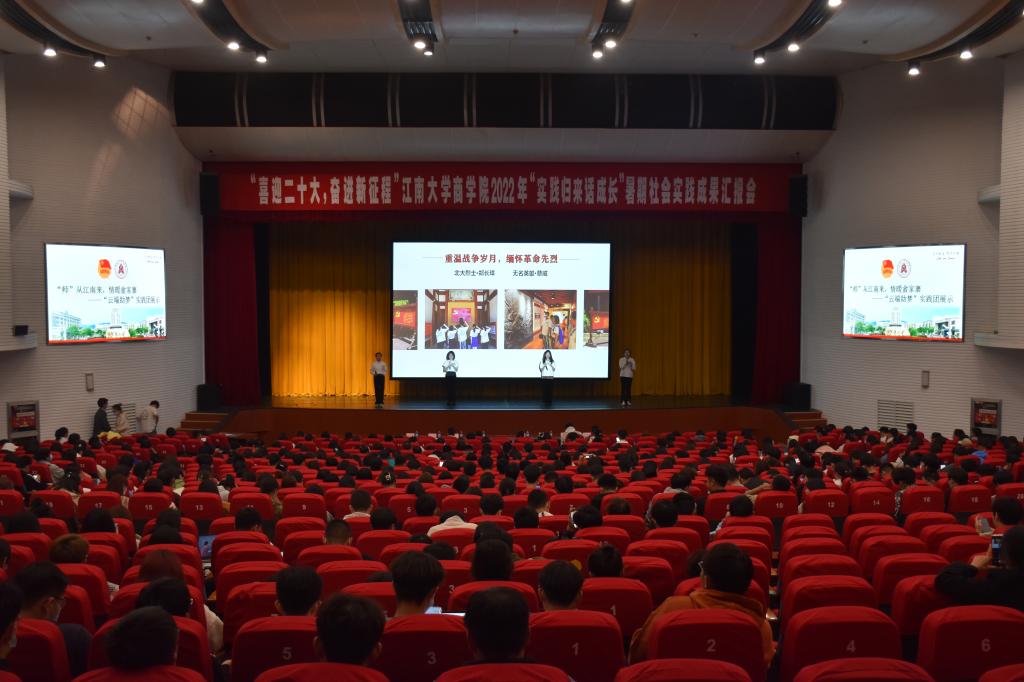 为充分展示社会实践优秀成果,积极引导青年大学生知行合一、开拓奋进,10月11日“喜迎二十大,奋进新征程”江南大学商学院2022年“实践归来话成长”暑期社会实践成果汇报会在文浩馆观众厅成功举办,院党委副书记兼副院长徐静、全体辅导员出席会议,全体2022级新生及大二学生骨干代表共658人参与此次活动,活动由分团委书记王璁主持。