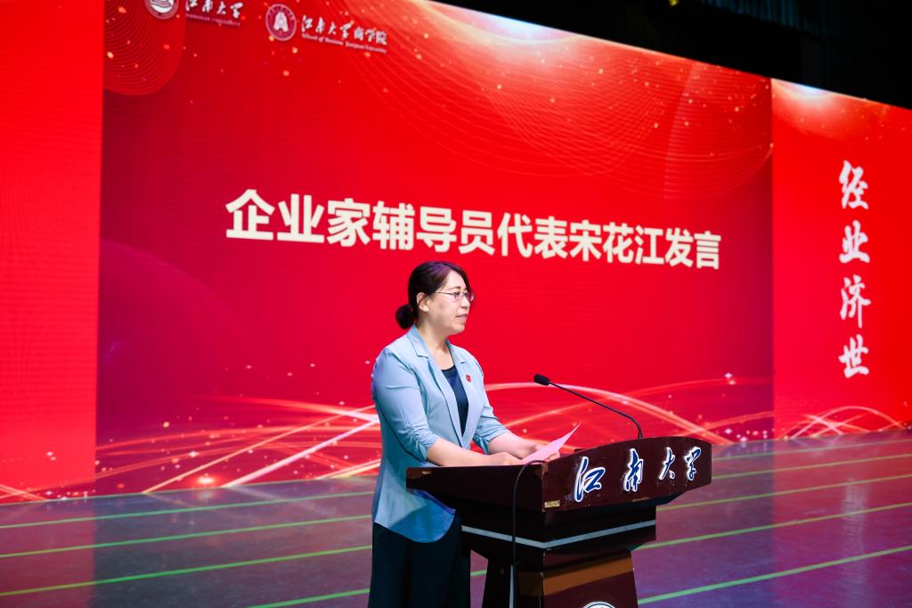 毕业生带班企业家辅导员代表、企业家辅导员主席团副主席、无锡意凯自动化技术有限公司董事长宋花江女士发言,她精彩生动的向同学们分享了自己的成长感悟,祝福同学们各自奔赴美好未来,鼓励同学们努力奋斗,积极进取,敢于直面困难,勇于把握机遇,引发了同学们的深思、鼓舞了同学们的斗志。