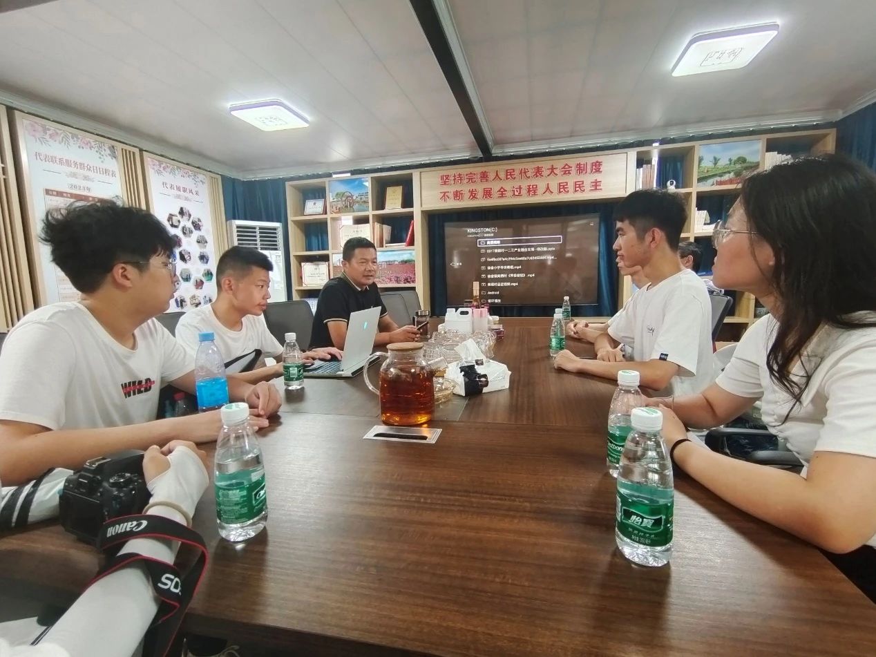 此外,实践团成员集体前往美栖村村委会,与担任宜兴市淳美文化发展有限公司法人的蒋向东就美栖村玫瑰产业融合情况进行了交流。通过蒋向东的介绍,成员们了解到美栖村秉承“因地制宜”的原则,依托气候、土壤、资金、技术等条件,选择了种植可食用的墨红玫瑰作为三产融合的切入点,其优点在于花期长、衍生产品多。美栖村目前已经熟练掌握9种衍生产品的生产工艺,其中有2款自研发产品成功申请国家专利。