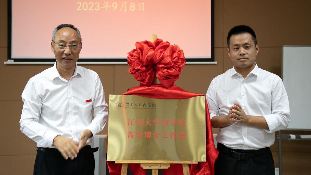 9月8日下午,商学院举行“青年博士工作室”揭牌仪式,江南大学党委常委、统战部部长、校工会主席朱飞,商学院党委书记刘长青,院长浦徐进,副院长刘勇,院分工会主席周方召,学院青年教师及博士生等50余人参加了活动。仪式由刘长青主持。
