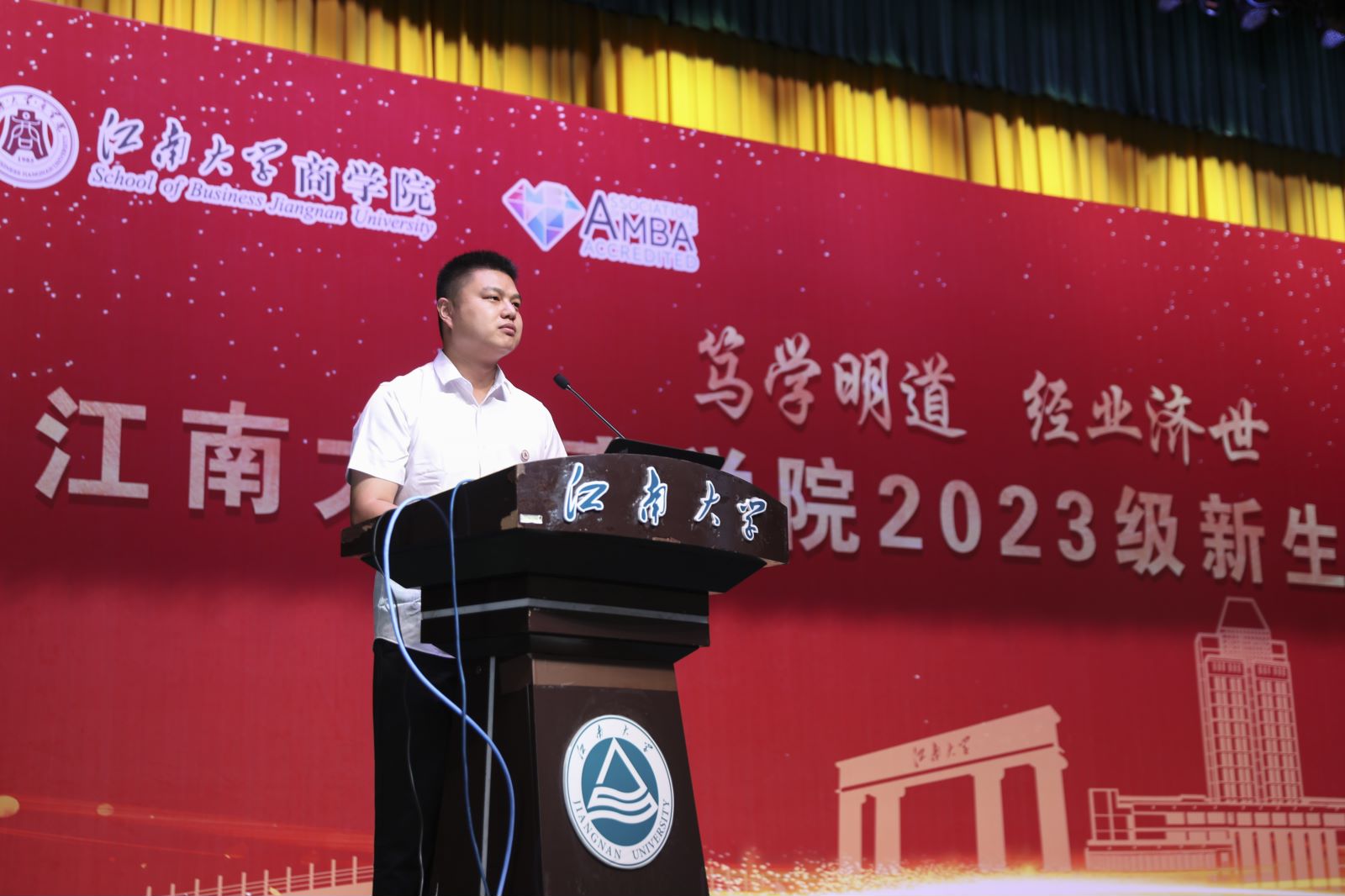 MBA教育中心研究生新生代表易文斌同学向同学们分享了备考过程的辛苦不易以及考上后的骄傲自豪,而后他代表MBA和MEM的全体新生向老师们做出承诺:“将时刻牢记是一名江南商院人,以身作则,认真学习,努力实践,为MBA和MEM项目的发展、为母校美好的明天、为建设科技强国做出自己的贡献。”