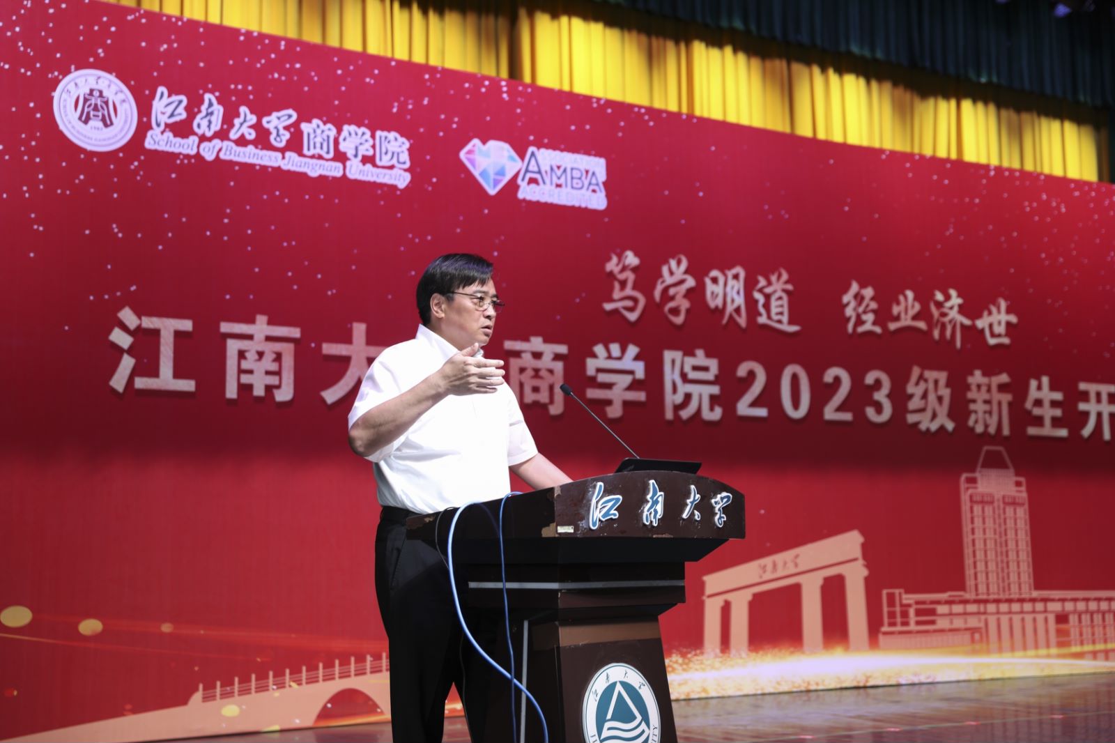 江南大学校董会名誉校董、江苏金山环保工程集团董事长钱盘生向学院全体教职工致以节日祝福,向2023级新生们表示衷心祝贺。他向同学们提出三点嘱托:一是希望同学们放下考入江大的荣光,认真思考如何让自己成为社会主义接班人和建设者,始终坚持“铁肩担道义,妙手著文章”的社会使命和家国情怀,立志成为人类文明进步的贡献者;二是希望同学们在接下来的学习中,迈开青春矫健的步伐,以更加积极进取的姿态把握自己的学习生活,适应环境变化,打牢学业基础,在挑战自我中成长,在自强不息中成才;三是希望同学们打好人格精神和人文关怀的底子,不断开拓自己的精神空间,陶冶自己的性格情操,提高自己的审美境界,激活自己的创新能力,做一个全面发展的新时代大学生!