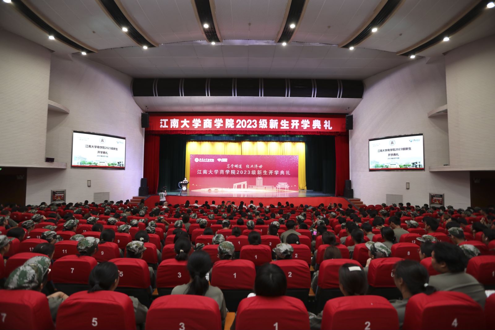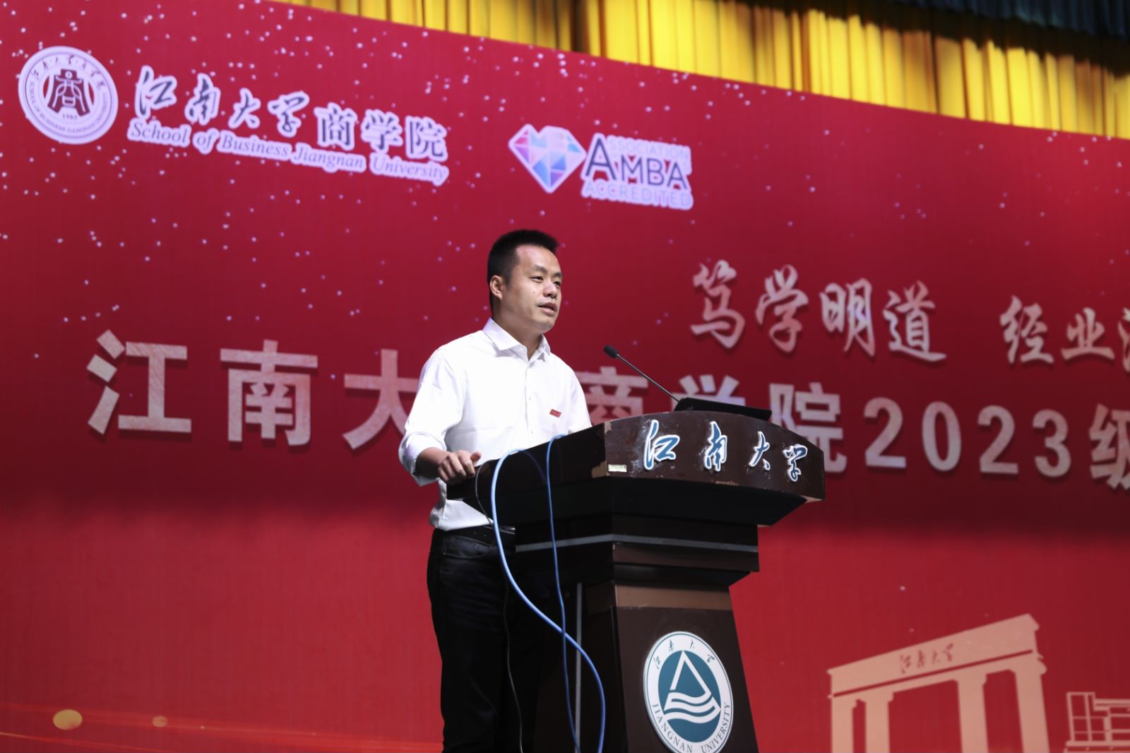 在雄伟而庄严的国歌声中,典礼正式拉开序幕。商学院院长浦徐进对新生的到来表示热烈欢迎。浦徐进总结了商学院办学三十八年以来在学科建设、人才培养等方面取得的成效;强调了学院“厚植江南工商文化、立足中国管理实践、贡献商科学术新知,培养具有全球视野的未来领导者”的办学使命;回顾了商学院与无锡百年工商文化的深厚渊源;阐述了波澜壮阔的新时代对商科发展提出的新命题;介绍了学院为实现学科特色鲜明、产教深度融合、国际化优势凸显,能够提供数智时代高质量商学教育的商学院建设目标所提出的规划。浦徐进对新生提出了四点希望:第一,做站在“巨人”肩膀上的前进者,要虚心向历史学习、向师长学习、向朋辈学习,于学中传承、学中创新、学中担当。第二,做持之以恒研读专业著作的阅读者,要静下心来研读,持之以恒阅读,从经典专著中了解学科历史,从最新书籍中洞悉学科前沿。第三,做躬身产业企业实践的奋斗者,要积极参与学院的产教融合改革,以“自讨苦吃”的心态躬身产业企业实践,从现实的角度加深对经济学理论知识的理解和掌握,培养“不唯上不唯书只唯实”的科学精神。第四,做朝气蓬勃、阳光快乐的新时代建设者,要使运动能够成为大学生活的标配,做青春洋溢、活力四射的时代新人。