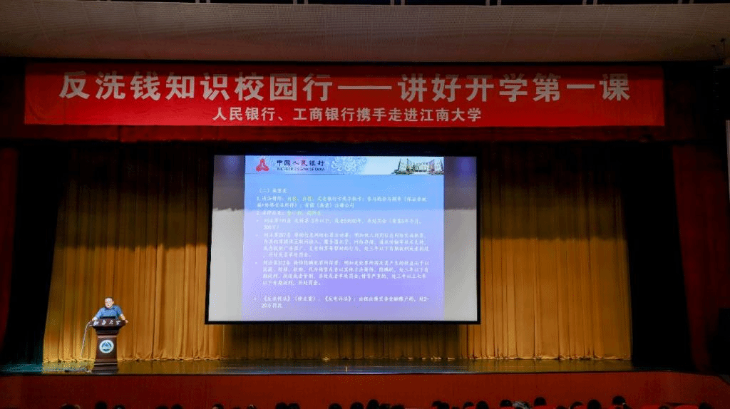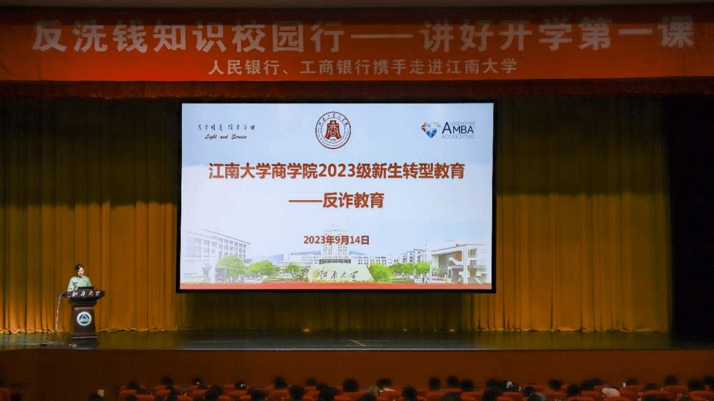 为增强新生安全意识,保护新生个人权益,9月14日,由保卫处牵头联系,邀请中国人民银行、中国工商银行携手走进江南大学,中国人民银行无锡市分行反洗钱科科长吴霄峙面向2023级商学院新生开展了主题为“反洗钱,助你反诈增智”的讲座。