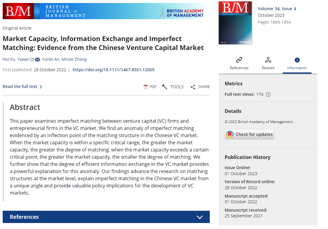 近日,国际权威期刊《British Journal of Management》正式刊发了商学院付辉副教授作为第一作者与合作者共同完成的论文“Market Capacity, Information Exchange and Imperfect Matching: Evidence from the Chinese Venture Capital Market”(市场容量、信息交换与不完美匹配:来自中国风险投资市场的证据)。
