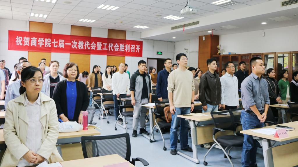 大会在雄壮的中华人民共和国国歌声中开幕。刘长青首先向与会代表汇报商学院七届一次教代会暨工代会换届筹备工作情况。