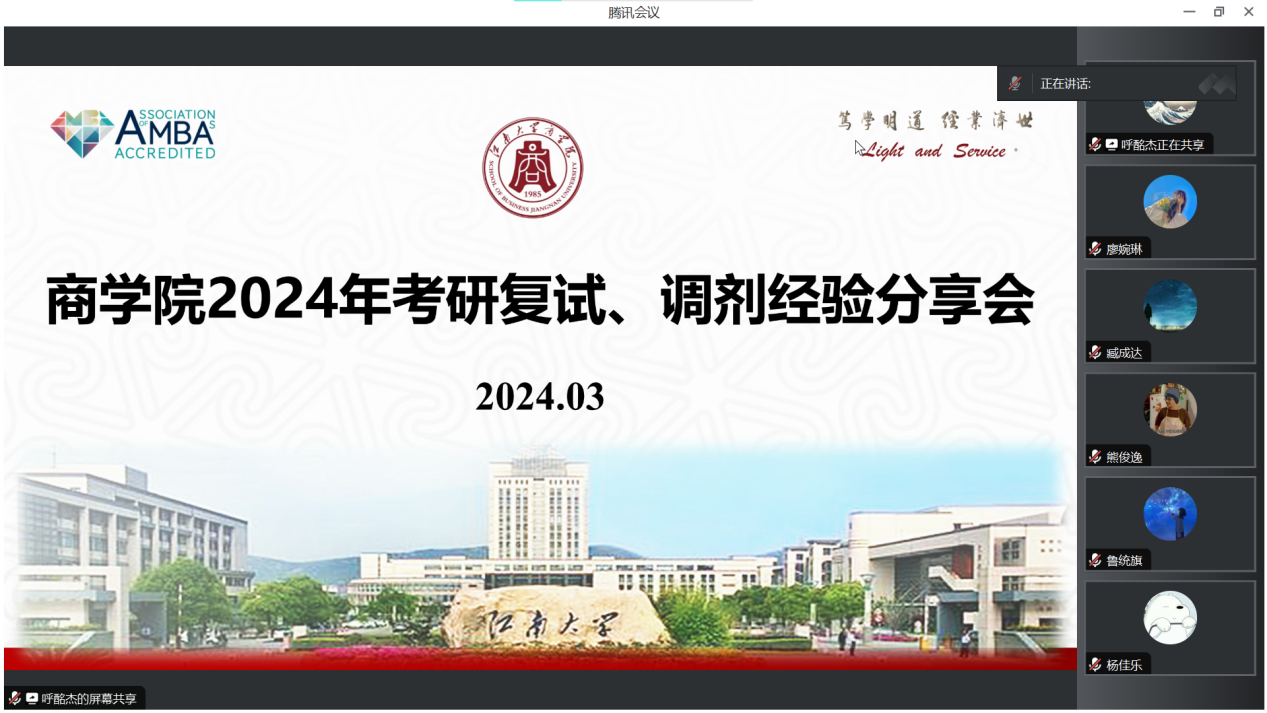 乘风助研路,奔“复”向未来。3月22日下午,商学院2024年考研复试调剂经验分享会在商学院117会议室和线上腾讯会议同步开展。本次分享会邀请了2019级高吾雨、鲁统旗、臧成达、甘晓倩,2018级李思雪五位成功上岸的学长学姐分享自己考研复试、调剂心得。共计68名2020级本科生参加分享会。