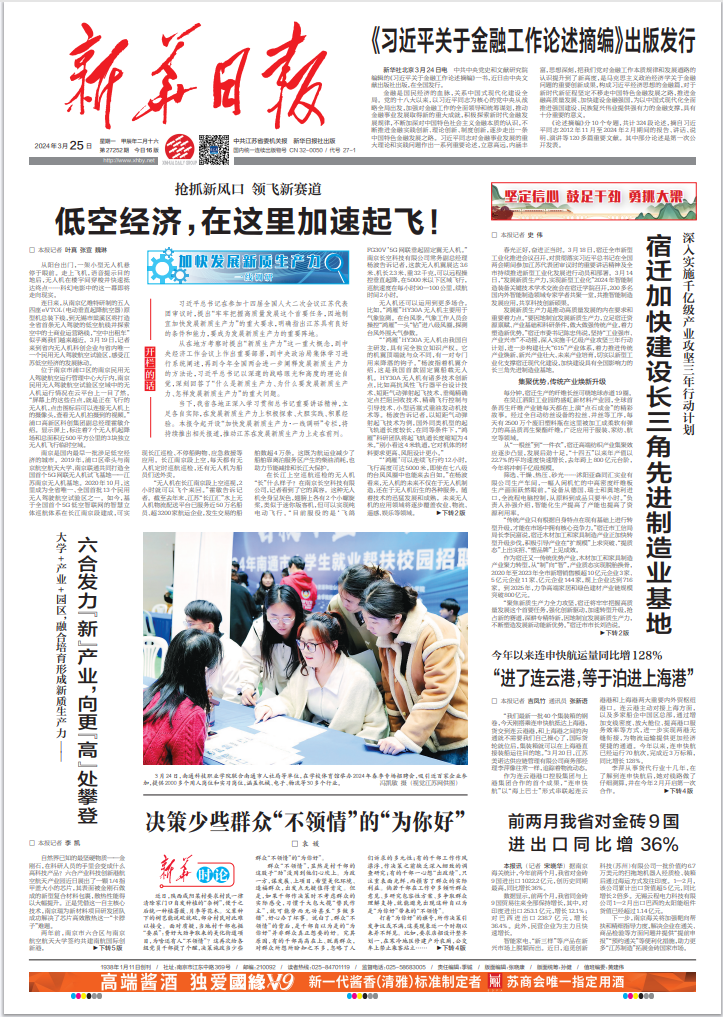 《新华日报》2024年3月25日头版“加快发展新质生产力·一线调研”专栏,刊登“低空经济,在这里加速起飞”文章,抢抓新风口,领飞新赛道。我校浦徐进教授接受《新华日报》专访并发表观点。