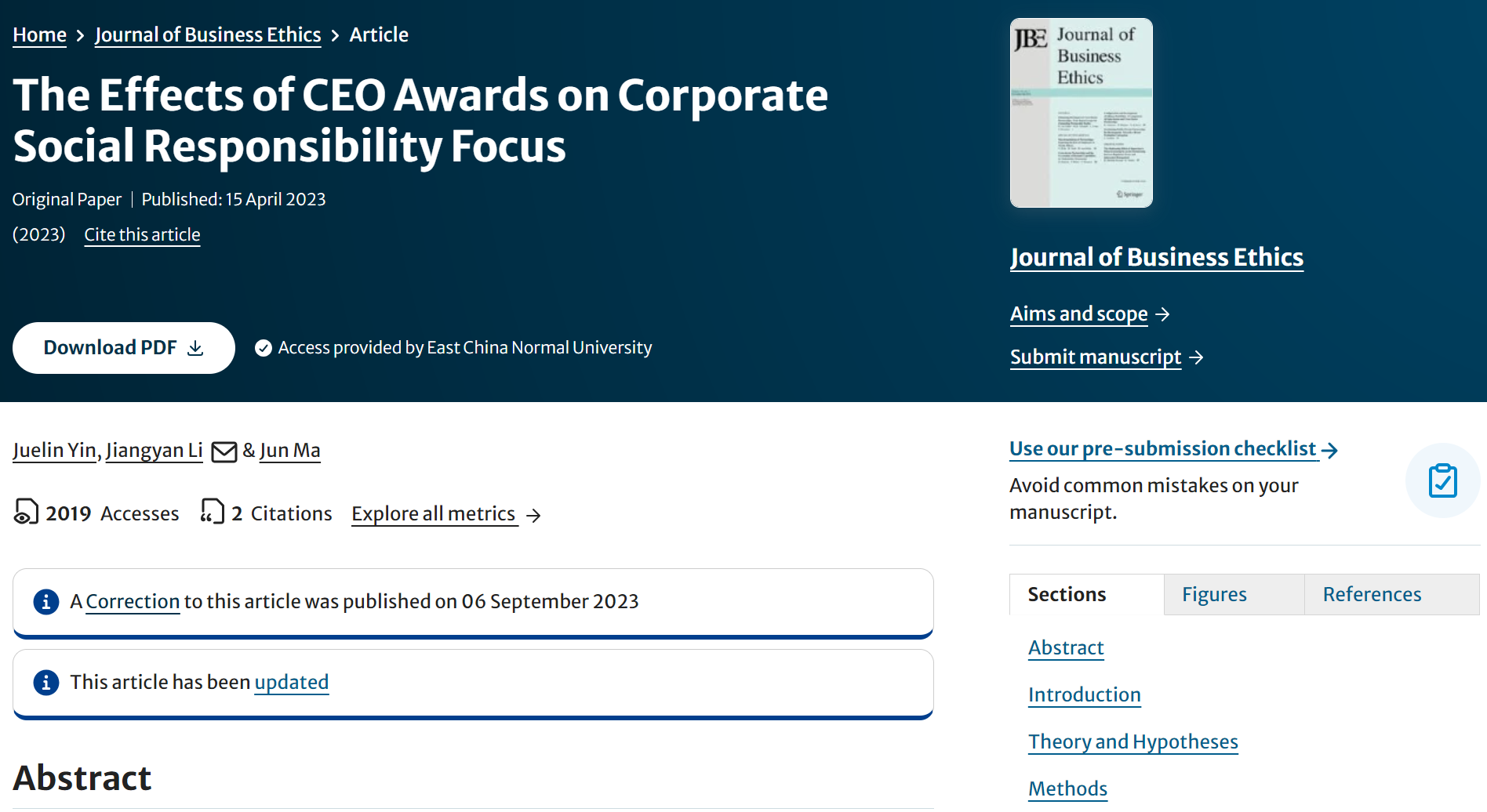 近日,国际权威期刊《Journal of Business Ethics》在线发表了商学院马骏副教授与合作者共同完成的论文“The Effects of CEO Awards on Corporate Social Responsibility Focus”(CEO获奖对企业社会责任关注重点的影响效应)。