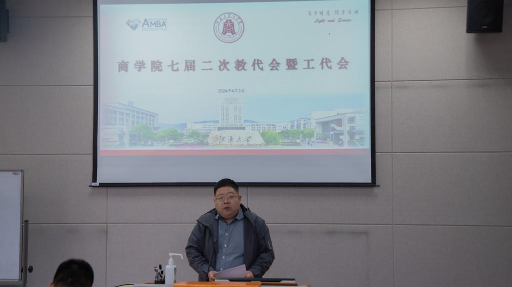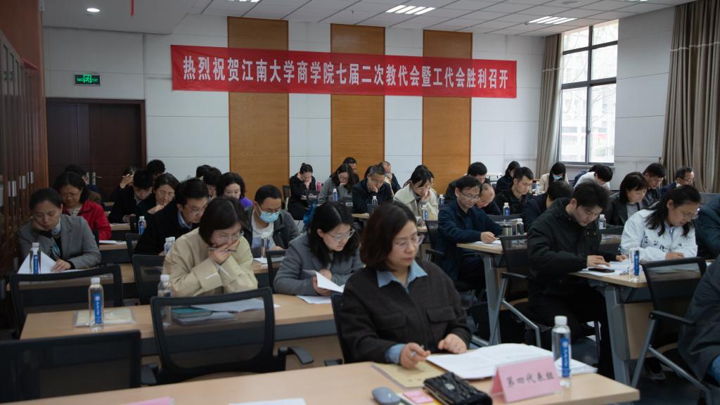 4月3日下午,江南大学商学院第七届教职工代表大会暨第七届工会会员代表大会第二次会议在商学院123会议室召开。50名教代会暨工代会代表出席会议,会议由商学院党委书记刘长青主持。