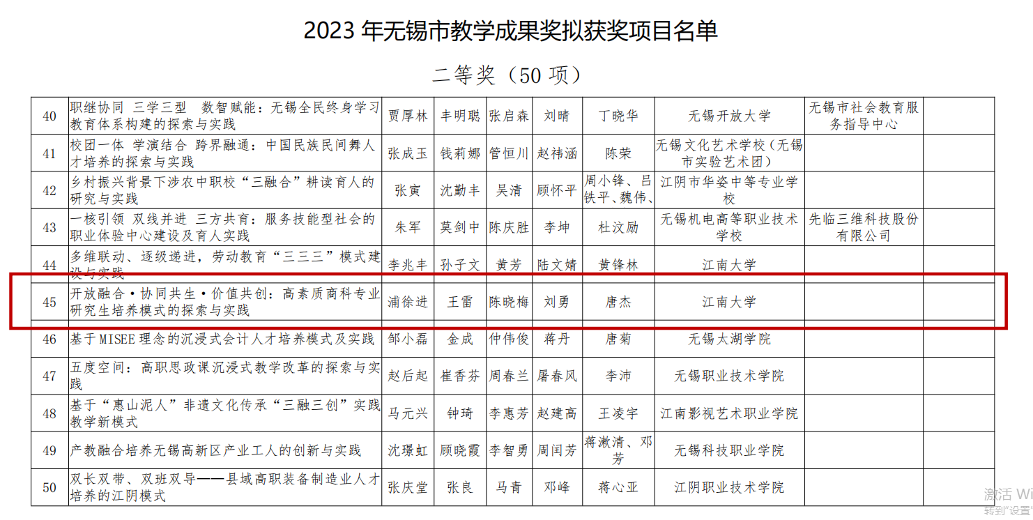 近日,商学院“开放融合·协同共生·价值共创:高素质商科专业研究生培养模式的探索与实践”项目获得无锡市教学成果奖二等奖。