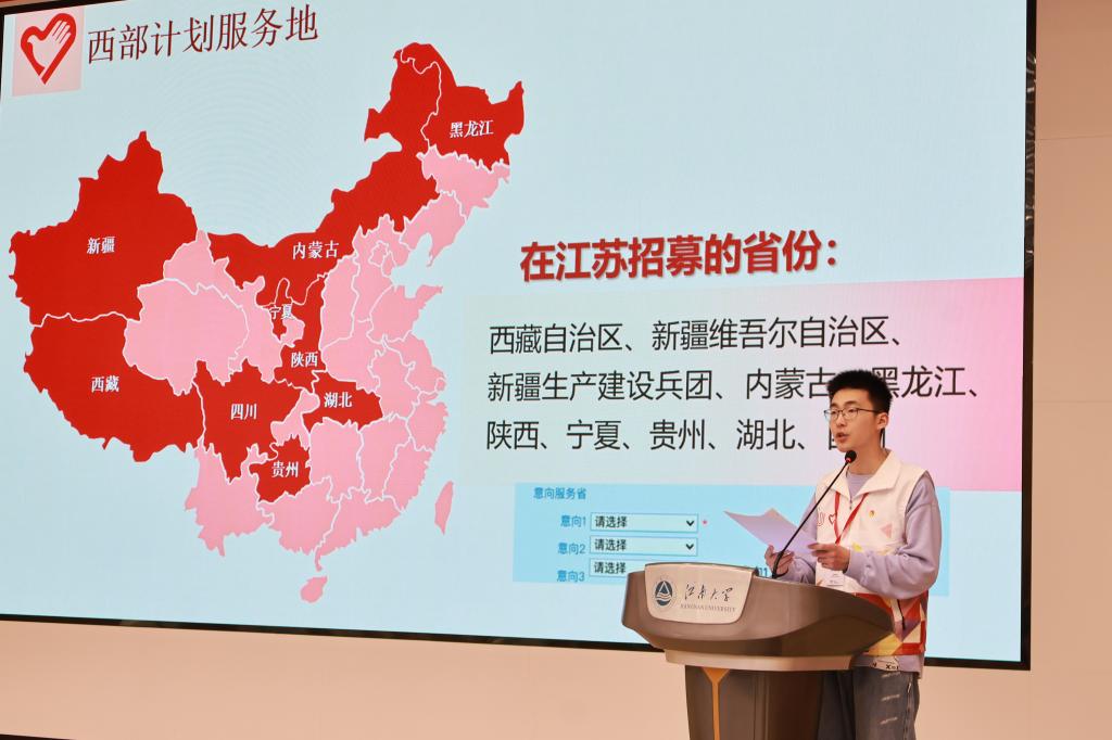 活动伊始,校青协副主席荣鲲为在场同学进行了两项计划的政策解读。荣鲲从大学生志愿服务西部计划介绍、江苏大学生志愿服务乡村振兴计划介绍、政策保障、常见问题答疑、招募选拔流程等方面为大家做了详细说明,他寄语同学们“用一年不长的时间,做一件终生难忘的事”,积极投身到两项计划中来。