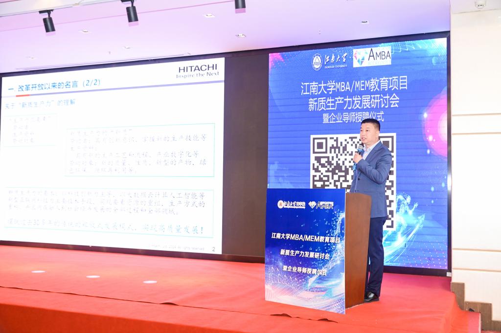 2022级企业导师代表日立泵制造(无锡)有限公司总经理马永红应邀做了题为《关于新质生产力的浅见》的分享,马永红引用企业实际案例对比分析了新质生产力背景下企业在实践中的创新,对改革创新生产关系、形成新的管理模式和体制机制进行了深入解读。