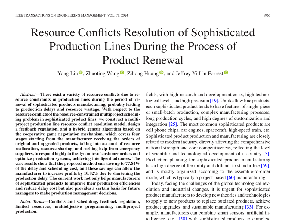 近日,江南大学商学院刘勇教授团队在工程管理领域重要期刊《IEEE Transactions on Engineering Management》发表题为“Resource Conflicts Resolution of Sophisticated Production Lines During the Process of Product Renewal”的研究论文。