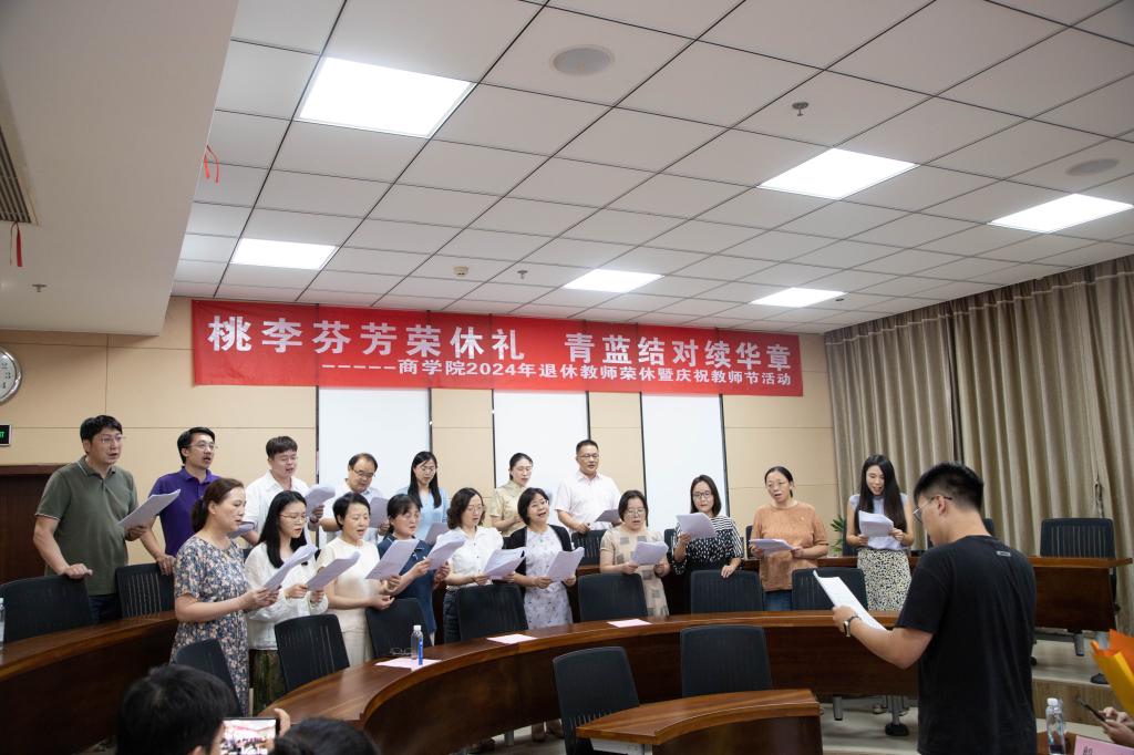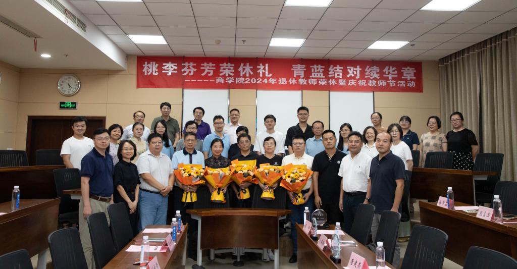 金秋九月,丹桂飘香。在第40个教师节来临之际,商学院2024年退休教师荣休暨庆祝教师节座谈会,于9月9日下午,在商学院116会议室举行。本次活动由院党委、院分工会与青年博士教工党支部联合举办,旨在大力弘扬教育家精神,加快建设教育强国,表达对荣休教师的感谢和敬意,并助力青年教师成长。商学院院领导、系主任、2023年下半年至2024年上半年退休教师、新入职教师、优秀教师代表及商学院教师合唱队成员参加活动。活动由院分工会主席赵海蕾主持。