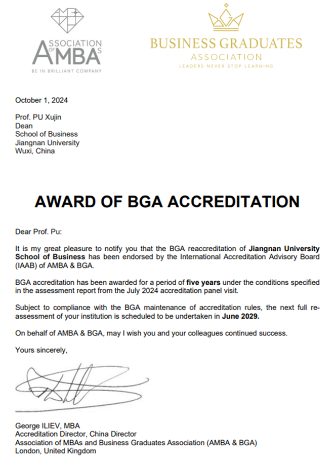 2024年10月1日新中国成立75周年之际,江南大学商学院收到英国工商管理硕士协会(Association of MBAs,简称AMBA)和商学院毕业生协会(Business Graduates Association,简称BGA)发来的官方邮件贺信,祝贺学院成功通过BGA(金牌)国际再认证,并获得五年最高认证期限。这是继2018年、2021年江南大学商学院获得AMBA以及AMBA&BGA联合认证后再次通过BGA国际认证,是对商学院教育教学质量、培养管理体系和国际化水平的再次肯定。
