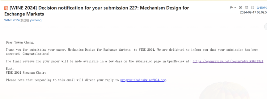 近日,计算经济学国际重要会议Conference on Web and Internet Economics,WINE2024正式录用我院程郁琨教授作为通讯作者的研究成果“Mechanism Design for Exchange Markets”。此篇论文是由北京大学郑宇森博士生、江南大学程郁琨教授、华东理工大学许晨阳助理教授和北京大学邓小铁教授合作完成。