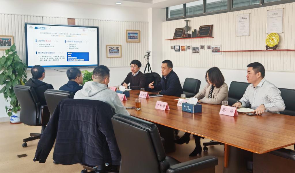浦徐进介绍了学院的发展状况,从学院内部设置、师资队伍、学科建设、研究生教育概况、科学研究、人才培养、国际交流等方面的特色与成果进行汇报。他指出,学院始终秉持着“培养创新人才、引领行业发展”的办学理念,努力成为学科特色鲜明、产教深度融合、国际化优势凸显,能够提供数智时代高质量商学教育的一流商学院。