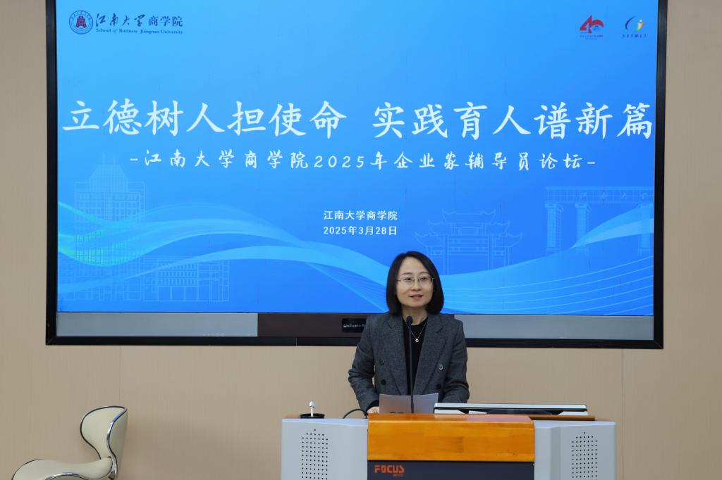 为进一步推动项目建设提质增效,3月28日下午,江南大学商学院在学院116会议室,举办2025年企业家辅导员论坛。本次论坛以“立德树人担使命,实践育人谱新篇”为主题,30余名企业家辅导员参加,共同探讨教育强国建设新征程中,新时代立德树人工程实施背景下,开启企业家辅导员“实践育人共同体”项目实施的新篇章。南京航空航天大学经济管理学院党委副书记胡苹,江南大学商学院产业特聘教授、江苏省(研究生导师类)产业教授、无锡市太极实业股份有限公司董事长孙鸿伟,江南大学商学院院长浦徐进、院党委副书记兼副院长孙小芳、副院长刘勇出席论坛。论坛由孙小芳主持。